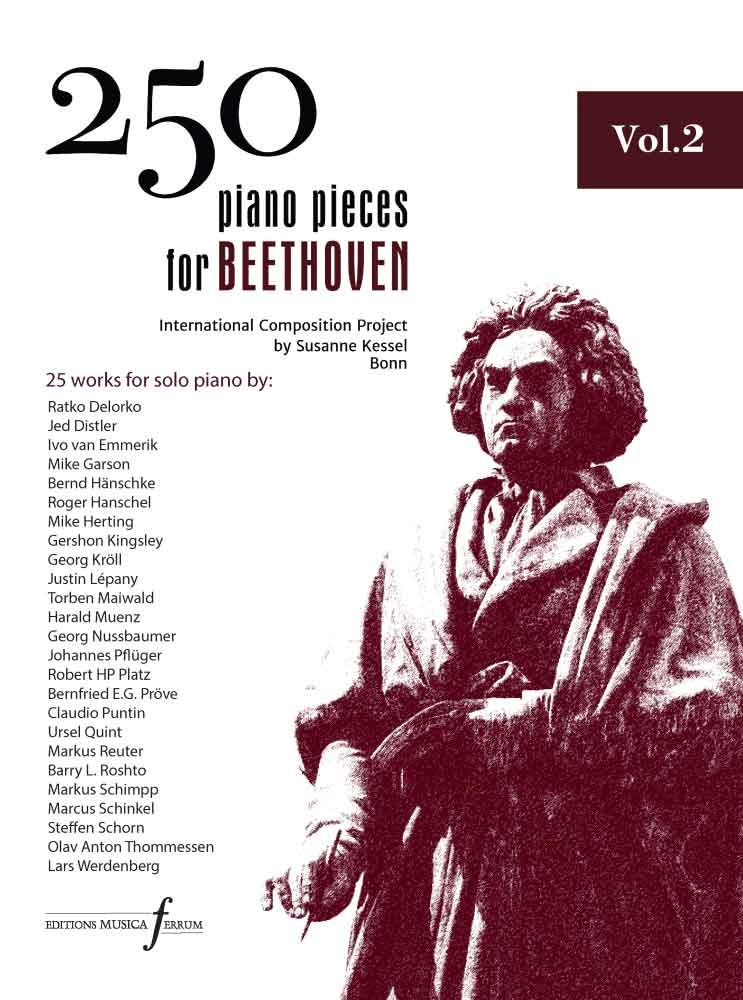 The second volume of the '250 piano pieces for Beethoven' project, initiated and organised by Susanne Kessel, in Bonn. Containing 25 out of the 250 total works to be composed for this project and offering a new view on the works, the life and the philosophy of Ludwig van Beethoven, this 152 page score is a monumental second volume to inspire and offer back to the audience.