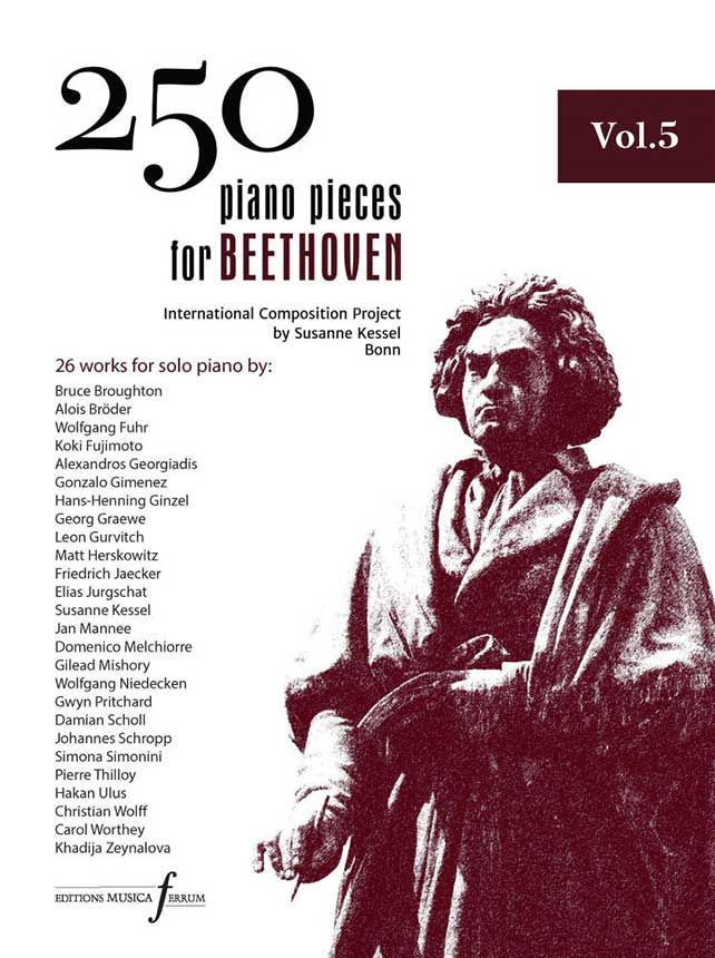 The fifth volume of the '250 piano pieces for Beethoven' project, initiated and organised by Susanne Kessel, in Bonn. Containing 26 out of the 250 total works to be composed for this project and offering a new view on the works, the life and the philosophy of Ludwig van Beethoven, this 160 page score is a monumental second volume to inspire and offer back to the audience.