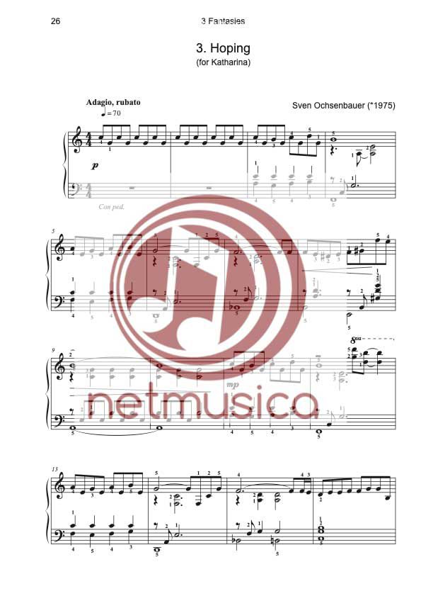3 Fantasies ist ein Album mit drei fließenden Klangstücken für Klavier solo. Die Kompositionen basieren zum Teil auf moderner Jazzharmonik und offenen sphärischen Klängen. Für fortgeschrittene Klavierspieler.