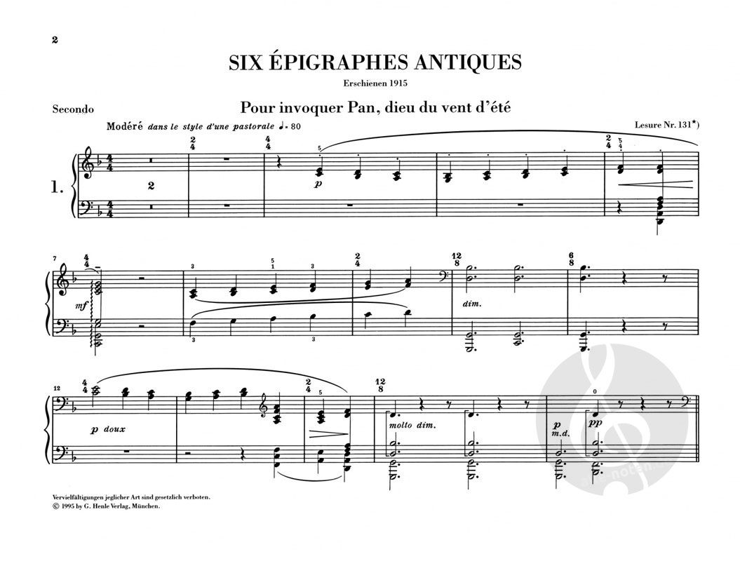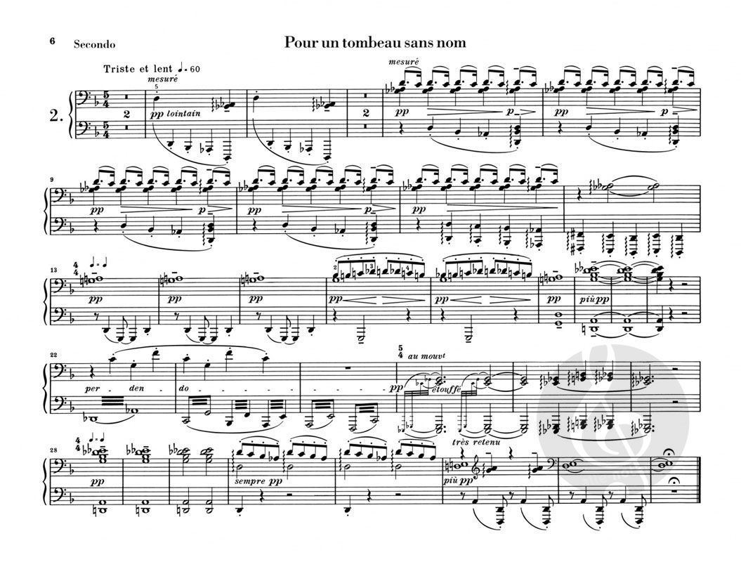 Um 1900 komponierte Debussy 12 kurze Stücke für zwei Flöten, zwei Harfen und Celesta als Schauspielmusik zu den Chansons de Bilitis (Übertragungen altgriechischer Gedichte der Kurtisane Bilitis) von Pierre Louys. Eine Aufführung kam zwar zustande, das Werk wurde aber zu Debussys Lebzeiten nicht gedruckt. Der Komponist schätzte seine Arbeit aber sehr und griff sie 1914 wieder auf, indem er sechs der alten Stücke auswählte und sie zu einem bedeutenden neuen Zyklus für Klavier zu vier Händen umformte. Gleichzeitig fertigte er auch eine zweihändige Version an (HN402). Debussy gelang es in beiden Fassungen, die delikate Schauspielmusik in einen farbigen, klangvollen Klaviersatz zu überführen.