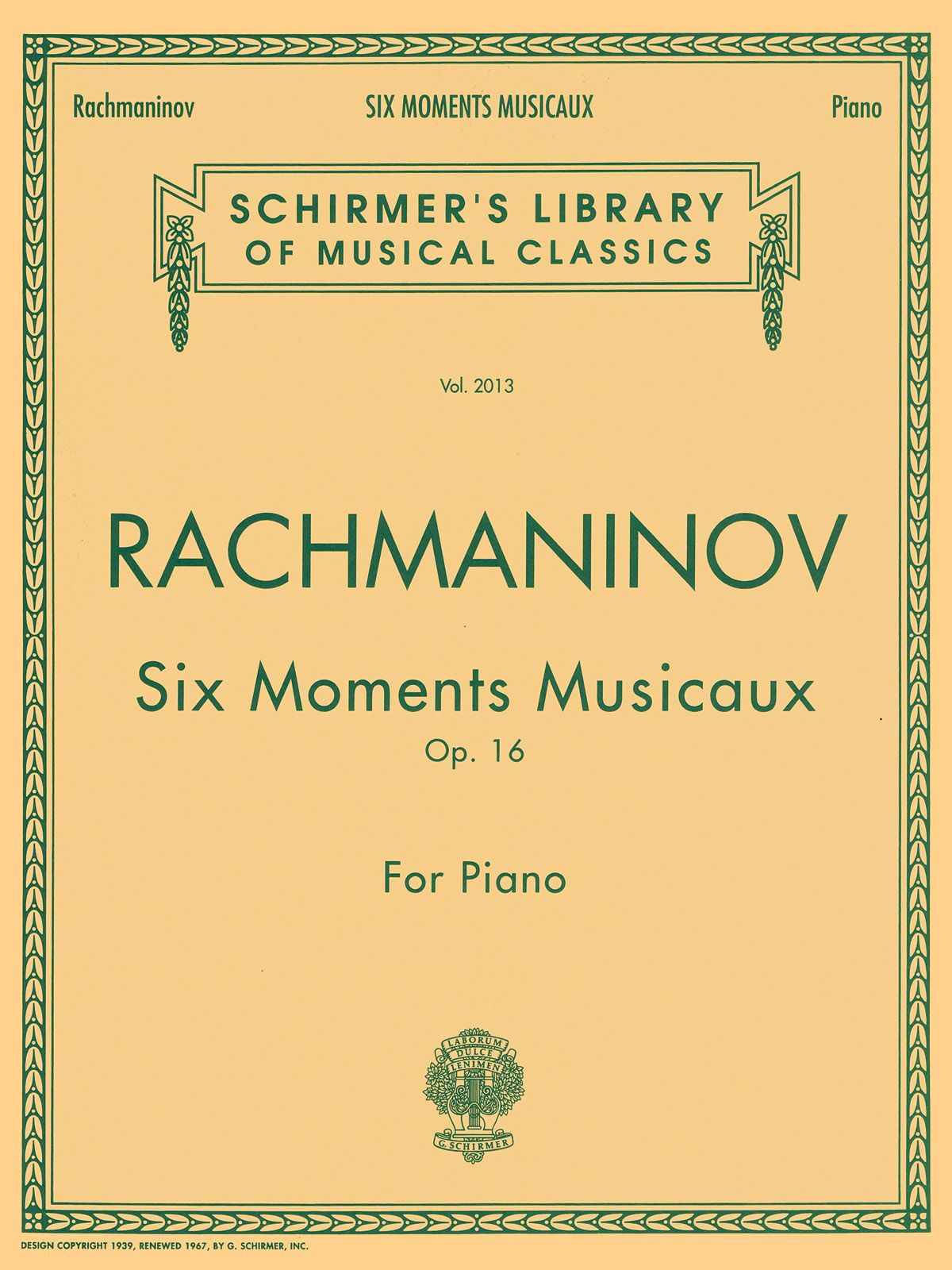Rachmaninov Six Moments Musicaux Op. 16 for solo piano. Suitable for advanced pianists. Volume 2013 in Schirmer's Library of Musical Classics.