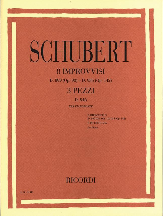 Dieser besondere Band enthält die 8 Improvvisi D. 899 (Op. 90) und D. 935 (Op. 142) PLUS den 3 Pezzi D. 946. Die hochwertige und dennoch preiswerte Ausgabe ist auf dem berühmten elfenbeinfarbenen Papier der Reihe E. R. Classica e Didattica Ricordi gedruckt.