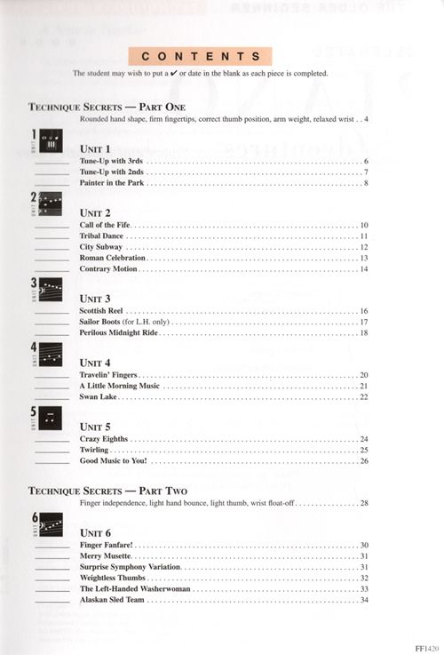 Dieser Technikkurs wurde für Teenager oder Quereinsteiger entwickelt und kombiniert "Technikgeheimnisse" aus dem Primer und Level One mit neuen Übungen, die mit dem Accelerated Piano Adventures Lesson Book One korrelieren. Durch die Integration von Technik und Kunstfertigkeit erhalten die Schüler das Rüstzeug für ein ausdrucksstarkes Spiel. Technique Secrets" entwickelt eine technische Grundlage, während die "Artistry Magic"-Seite am Ende jeder Einheit das ausdrucksstarke Spiel erforscht. [Beispielseite ansehen] [Beispielseite ansehen] [Beispielseite ansehen]