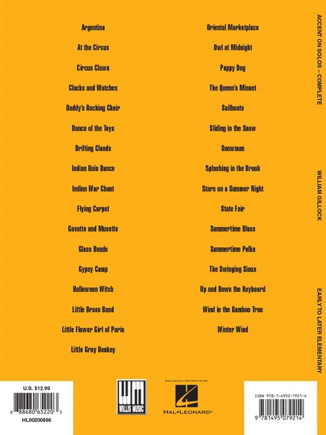 A newly edited and engraved compilation of all 3 of Gillock's popular Accent on Solos books. These 33 short teaching pieces have been in print for over 50 years and the music continues to motivate piano students of every age.