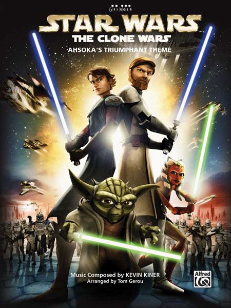 The Clone Wars with your piano students. 'Ahsoka's Triumphant Theme' is one of the most beautiful selections from the hit movie and has been arranged in traditional five-finger style, with the melody split between the hands, and without key signatures in the student part. Starting hand positions are illustrated above each piece. Fingerings that are outside the noted five-finger positions and those indicating a shift in hand position are circled for easy identification. Dotted quarter notes, triplets and sixteenth notes have been avoided. Leader lines in lyrics are omitted to avoid clutter. All of the melodic arrangements have optional duet accompaniments created to achieve a fuller, richer musical experience.