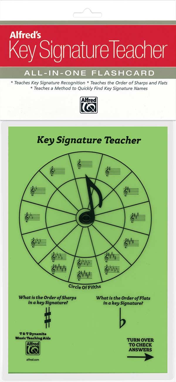 Experience dynamite results learning key signatures with Alfred's Key Signature Teacher. This excellent teaching aid provides an interactive way to learn the order of sharps and flats, all major and relative minor key signatures, and much more! How It Works: *Turn to the side without key names. *Spin the dial to a key signature of your choice. *If you know the name of the key signature (major or minor), say it. If you don't know the name, turn the flashcard over to view the answer. *Continue this process to master all the key signatures.