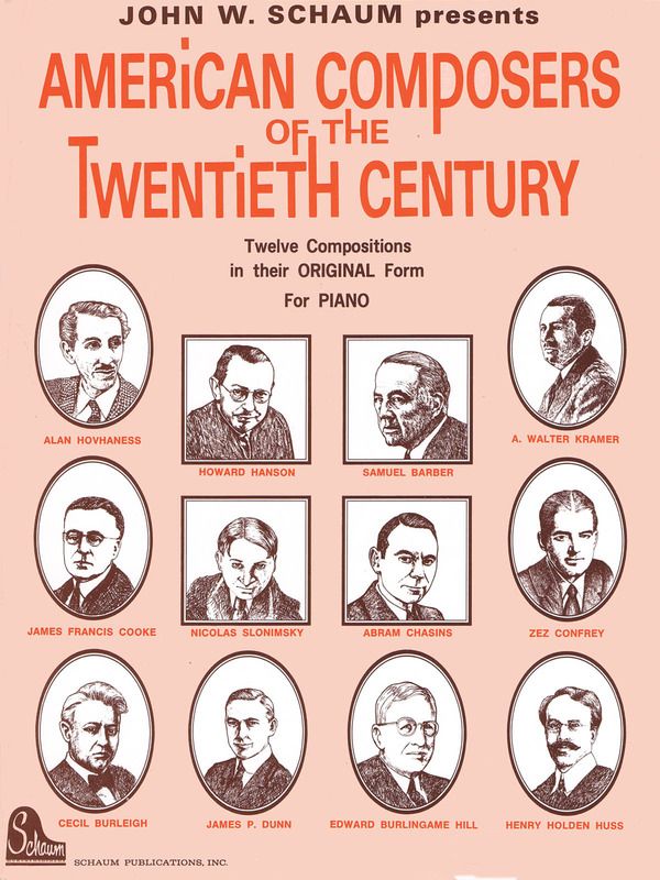 John W. Schaum presents 12 original compositions by famous Americans for the advanced pianist including: Samuel Barber: Love Song: Cecil Burleigh: Mazurka, Op. 3 #3: Abram Chasins: Prelude in C Minor, Op. 13 #1: James FrancisCooke: Twilight at Carcassonne: Zez Confrey: After Theater Tango: James P. Dunn : Bewitched: Howard Hanson: Impromptu, Op. 19 #1: Edward B. Hill: March of the Mountains, Op. 7 #4: Alan Hovhaness: Fire Dance: Henry Holden Huss:Gipsy Dance: A. Walter Kramer: Silhouette: Nicholas Slonimsky: Dreams and Drums.