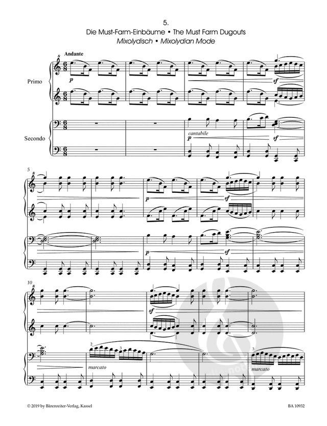 Die acht Stücke durchlaufen verschiedene Kirchentonarten, das erste und das letzte stehen in der ionischen Tonart. Dies erlaubt eine große Spannweite des bewegten Duos, obwohl alle Stücke ohne ein einziges Vorzeichen auskommen.