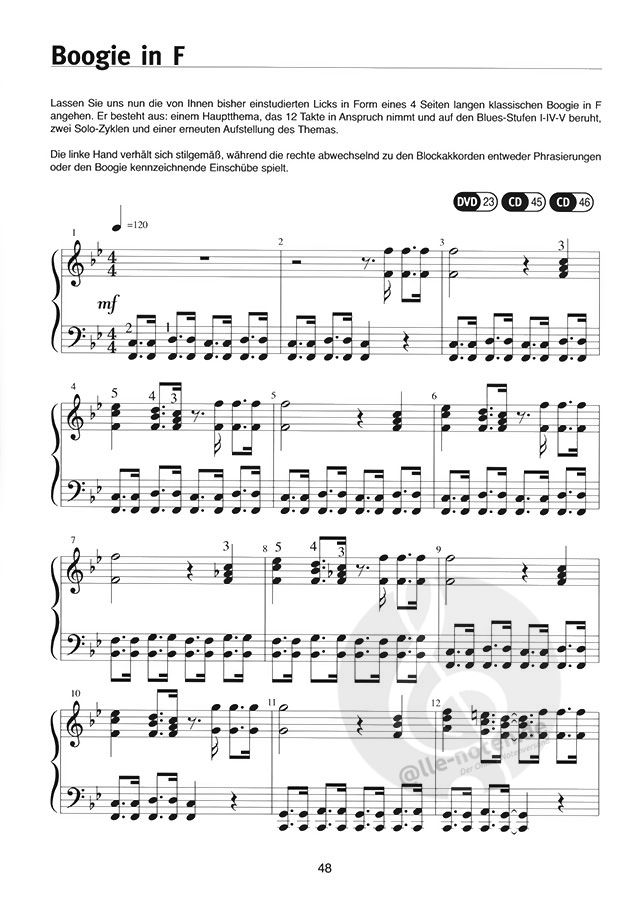 Um den Boogie am Klavier entspannt angehen zu konnen, sind die Obungen in diesem Lehrbuch progressiv gestaffelt. Sie beinhalten Licks, die fur diesen Musikstil kennzeichnend sind, die lhre linke genauso wie lhre rechte Hand trainieren und aus vollstandigen Musikstucken bestehen. Jedes dieser Stucke nimmt sich einer bestimmten Thematik an: einer ganz besonderen Technik, einer charakteristischen Phrasierungsform, eines gewissen Lick-Prototypen, des in diesem Musikstil üblichen Timings, oder aber improvisierter Variationen zu dem harmonischen Grundgerüst des Boogie-Woogie.