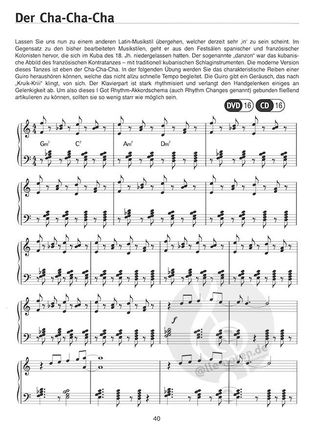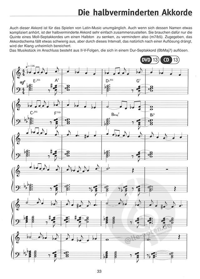 Dieses Lehrbuch ist für Klavier-Spieler, oder auch Spieler anderer Tasten-instrumente bestimmt, die sich für Latin- oder südamerikanische Rhythmen interessieren. Darin werden Sie zu Beginn die Grundlagen der Harmonielehre wiederholen, um im Anschluss dazu alle Akkorde, die für die verschiedenen Latin-Musikstile kennzeichnend sind, durchzugehen und zu erfahren, wie diese musikalisch anzuwenden sind. Durch das Üben von Musikstücken, die speziell auf das Begleiten ausgerichtet sind, werden Sie binnen kurzer Zeit in die Lage versetzt, in einer Band mitzuspielen und den Latin-Grundrhythmen beizukommen. Mittels einfacher, stichhaltiger Erklärungen wird Ihnen gezeigt, wie Improvisationen in diesen Musikstilen zu gestalten sind und somit Soli interpretiert werden. In diesem Lehrbuch finden Sie die ganze Latin-Rhythmen-Bandbreite - von der Samba angefangen, über die Guajira, den Son Montuno, den Cha-Cha-Cha, den Salsa oder aber den Blue-Bossa, bis hin zum Bossa Nova! Damit Sie all das leichter verstehen, ist jede der im Lehrbuch enthaltenen Übungen auf DVD aufgenommen worden. Auf der Audio-CD hingegen werden Ihnen zahlreiche Playalongs angeboten, zu denen Sie entweder das eben Erlernte anwenden lernen, oder sich vollkommen frei entfalten können.