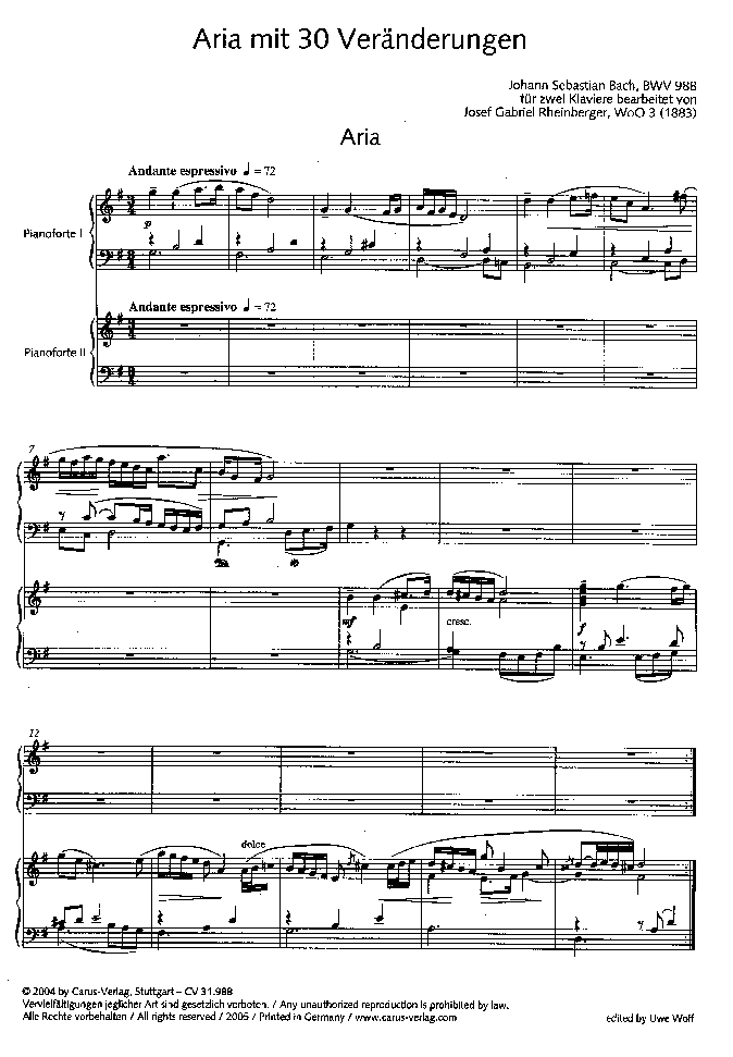 Goldberg-Variationen - Mit seiner Bearbeitung wollte Rheinberger das Werk der Praxis wieder zugänglich machen. Er begnügte sich freilich nicht mit einer Einrichtung der Variationen für zwei Klaviere, sondern unterzog die ganze Komposition einer tief greifenden Umgestaltung.