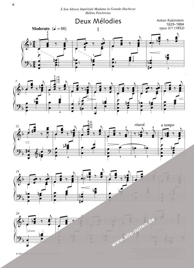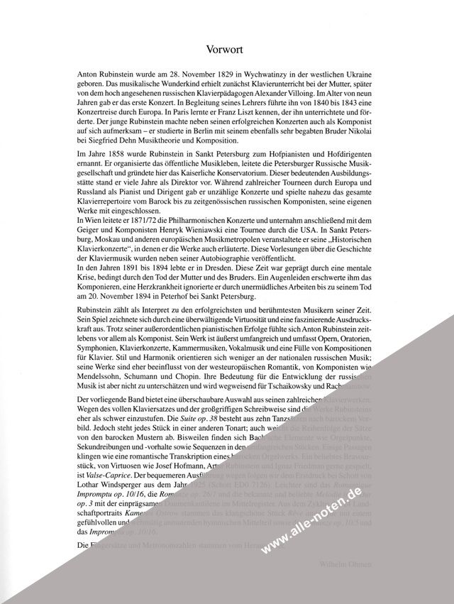 Anton Rubinstein (1829-1894), das musikalische Wunderkind aus der Ukraine, gab bereits im Alter von 9 Jahren sein erstes Klavierkonzert. Er war einer der erfolgreichsten und berühmtesten Interpreten seiner Zeit. Sein Spiel zeichnete sich durch eine überwältigende Virtuosität und eine faszinierende Ausdruckskraft aus. Der spätere Schüler von Franz Liszt machte bald nicht nur erfolgreiche Konzertreisen durch Europa, sondern auch als Komponist auf sich aufmerksam. Sein umfangreiches Werk, das zahlreiche Gattungen umfasst, wurde von der westeuropäischen Romantik beeinflusst, von Komponisten wie Mendelssohn, Schumann und Chopin. Der Band 'Ausgewählte Klavierwerke' bietet eine überschaubare Auswahl aus seinen zahlreichen Klavierwerken, darunter die beliebte 'Melodie' in F-Dur op. 3, das klangschöne 'Rêve angélique' sowie die Romanze op. 10/5 und 'Valse-Caprice', ein beliebtes Bravourstück. Wegen des vollen Klaviersatzes und der grossgriffigen Schreibweise sind seine Werke für fortgeschrittene Spieler zu empfehlen.