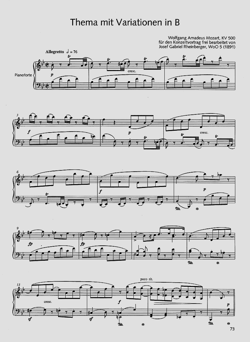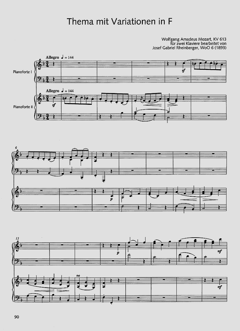 Pianisten und Liebhaber der Klaviermusik können sich über Band 48 freuen, der die Bach'schen Goldberg-Variationen BWV 988 in Rheinbergers Bearbeitung für zwei Klaviere (WoO 3) enthält. Durch Stimmverdopplungen, kontrapunktische Verdichtung der thematischen Arbeit und eine fantasievolle Verteilung des Originalsatzes auf die beiden Klaviere bearbeitet Rheinberger Bachs Variationszyklus im Stil des 19. Jahrhunderts. Zu diesem Monolithen der Klavierkunst treten die Bearbeitungen zweier Variationszyklen von W. A. Mozart (KV 500 und KV 613), in denen Rheinberger seinen behutsamen und zugleich kreativen Umgang mit den Originalkompositionen beweist.