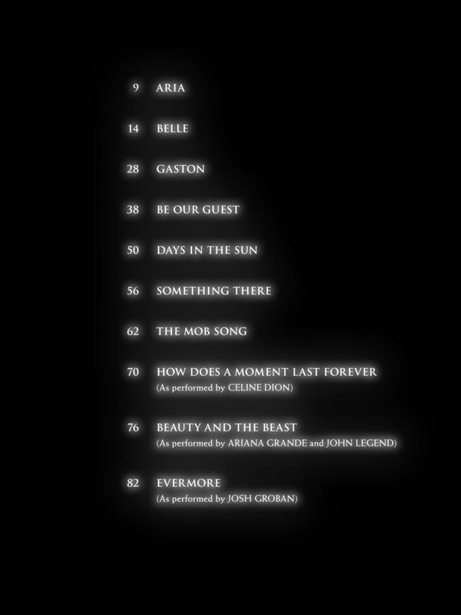 This 2017 live action film was inspired by the 1991 Disney animated classic and its successful score penned by Alan Menken and Howard Ashman. Its soundtrack features songs from the original film as well as new material written by Menken and Alan Rice. Our easy piano folio includes a new version of the title track 'Beauty and the Beast' as sung by Ariana Grande and John Legend, as well as a new original performed by Celine Dion, 'How Does a Moment Last Forever'.