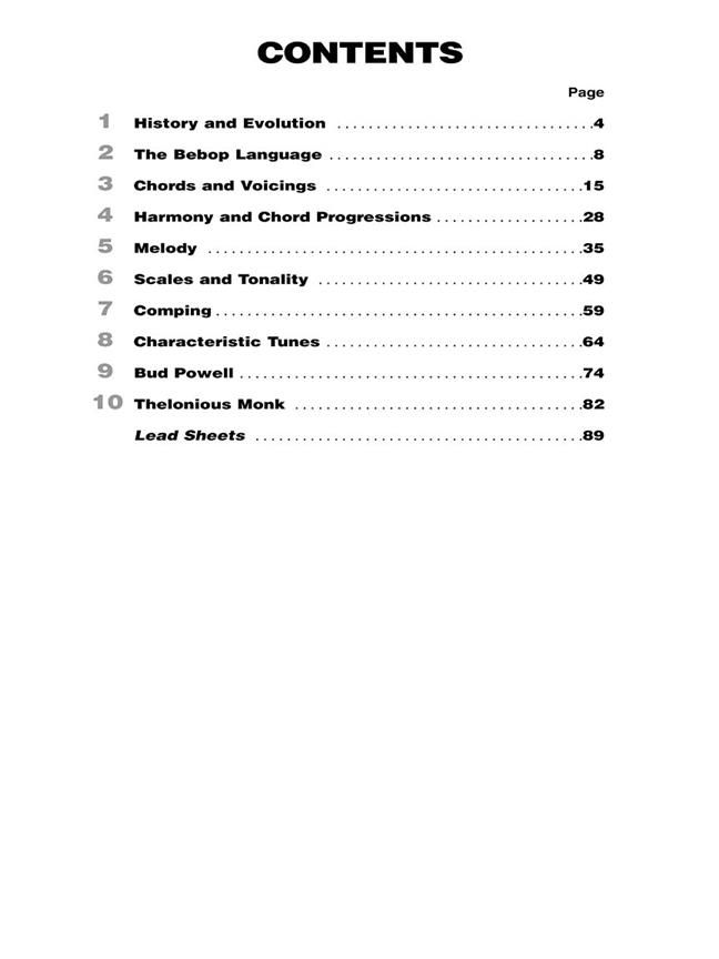 Chords and Voicings, Harmony and Chord Progressions, Scales and Tonality, Common Melodic Figures and Patterns, Comping, Characteristic Tunes, Styles of Bud Powell and Thelonious Monk, Online Audio included