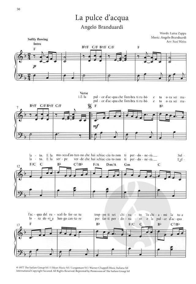 Die Reihe „Susis Piano Collection“ wird fortgesetzt mit Musik aus Italien. Die Sammlung enthält mittelschwere Bearbeitungen von Susi Weiss: unvergessene italienische Schlager, Canzone und Italo Pop von Interpreten wie Eros Ramazzotti, Paolo Conte, Angelo Branduardi, Lucio Dalla, Zucchero u.v.a.