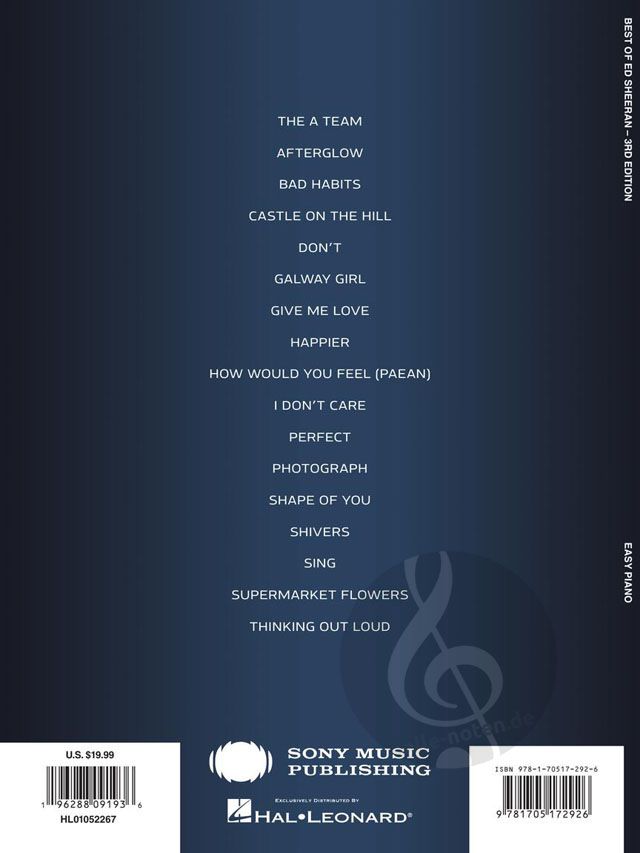 Der aktualisierte Sammelband enthält 17 Hits von Ed Sheeran aus seinen Alben von "The A Team" (2012) bis "Bad Habits" (2021) in leichten Bearbeitungen für Klavier mit allen Songtexten zum Mitsingen.