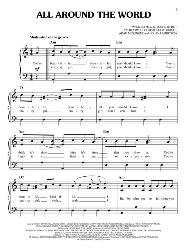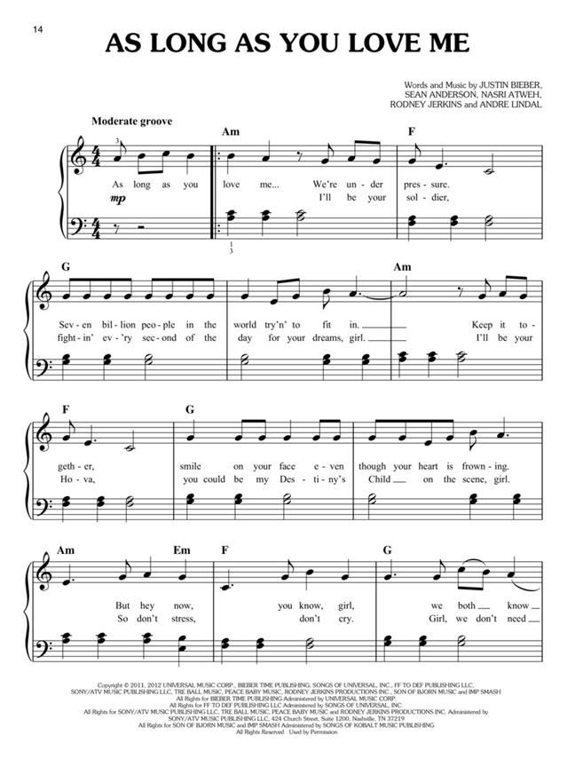 A dozen of Bieb's best in accessible easy piano arrangements with lyrics: All Around the World - As Long As You Love Me - Baby - Boyfriend - Despacito - Love Yourself - One Less Lonely Girl - One Time - Somebody to Love - Sorry - What Do You Mean? - U Smile.