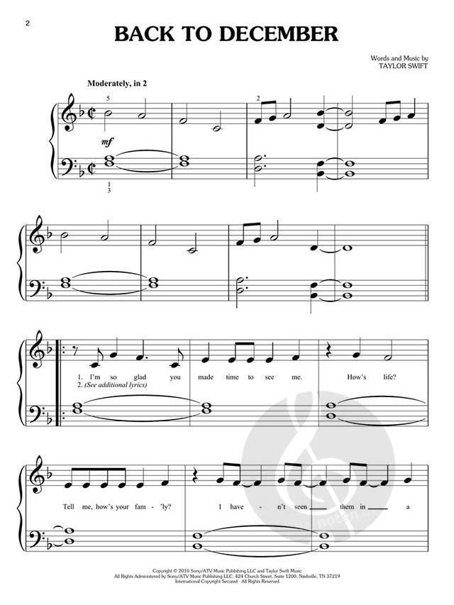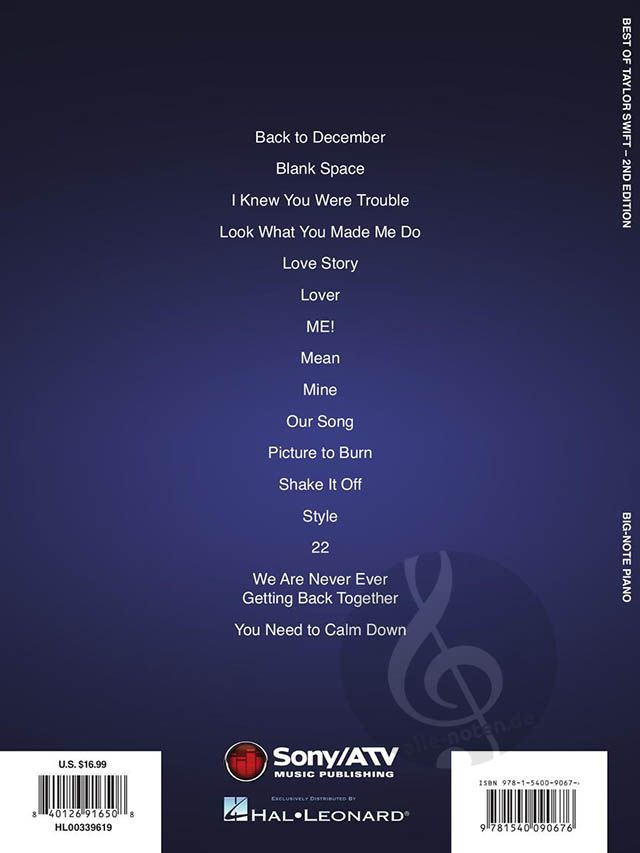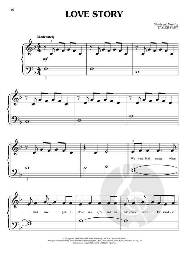16 of pop/country crossover queen Taylor Swift's best in big-note piano arrangements so beginning pianists can play her hits: Back to December - Blank Space - I Knew You Were Trouble - Love Story - ME! - Mean - Picture to Burn - Shake It Off - 22 - We Are Never Ever Getting Back Together - You Need to Calm Down - and more.