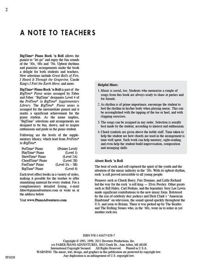 BigTime Piano Rock 'n Roll allows the pianist to 'let go' and enjoy the fun sounds of the '50s, '60s and '70s. Upbeat rhythms and pianistic arrangements make the book a delight for both students and teachers. New selections include: Piano Man - Great Balls of Fire - I Heard It Through the Grapevine - I Feel the Earth Move - and more.