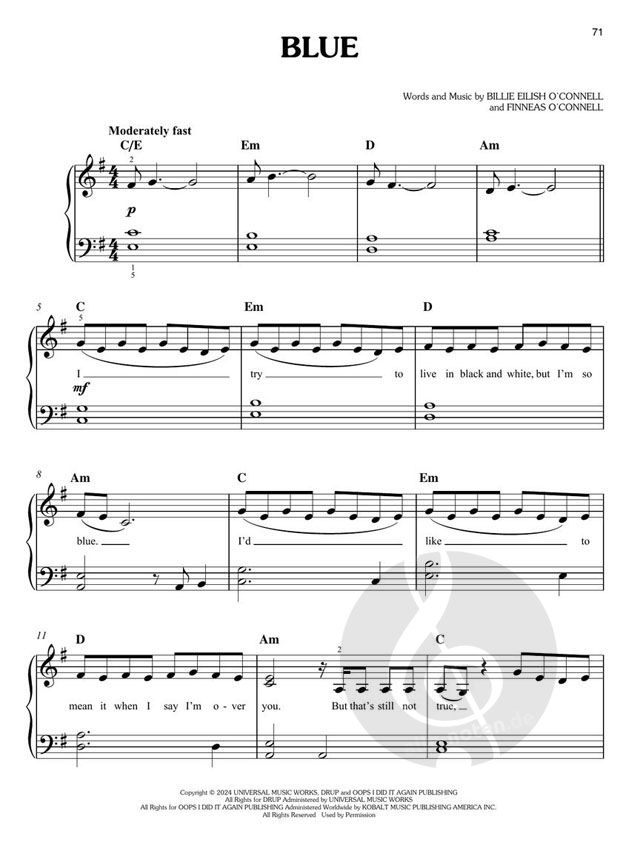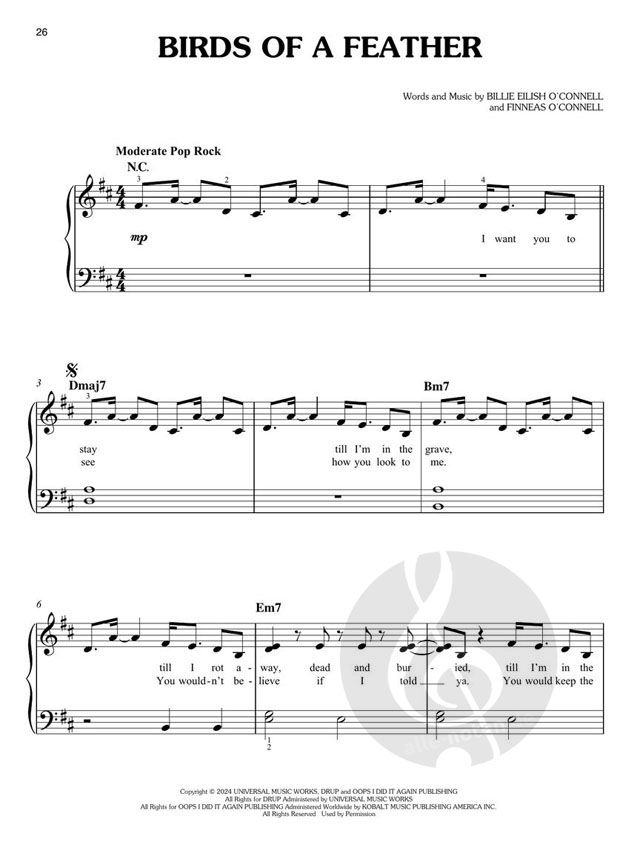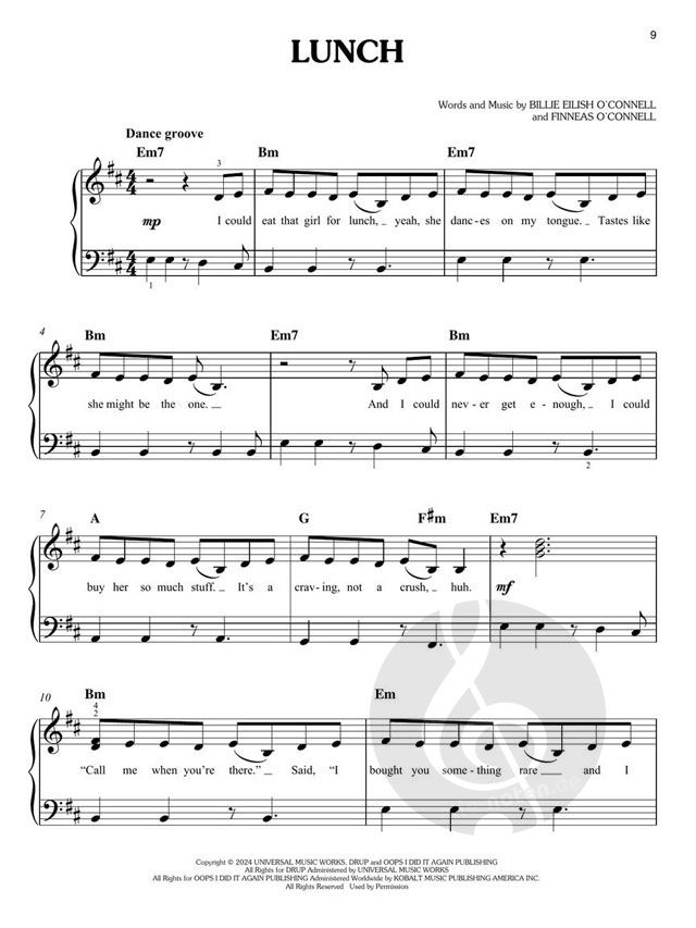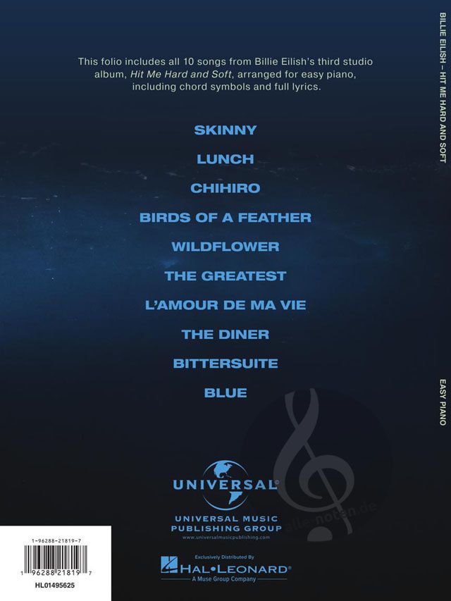 Billie Eilish has done it again! The highly-anticipated third album from the nine-time GRAMMY® winner features a sound that redefines and explores genre boundaries, trends and soundscapes, immersing listeners into a full spectrum of emotions. From Lunch to Birds of a Feather and Chihiro, there's plenty of hits to keep this record in the rotation for many years to come! Our matching folio features all 10 songs arranged for easy piano: Birds of a Feather · Bittersuite · Blue · Chihiro · The Diner · The Greatest · L'Amour de ma Vie · Lunch · Skinny · Wildflower. Note that the keys of some songs were transposed for ease of play.