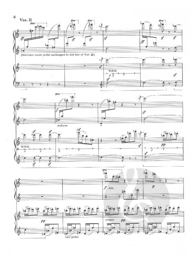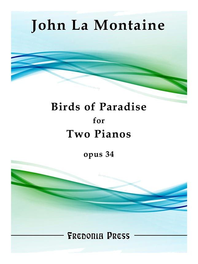 Birds of Paradise was originally composed for solo piano with orchestra. This edition is arranged by the composer for two pianos, with the second piano playing a reduction of the orchestral part. As two parts are needed for performance, there are two copies of the score included in this set. From the introduction: Birds of Paradise, Op. 34, created extraordinary interest when it was given its first performance (April 29, 1964) by the Eastman-Rochester Symphony Orchestra under the direction of Howard Hanson. A work of mysterious beauty, it reveals a comparatively new aspect of the composer's creative imagination. He has written of it: :'The musical ideas on which Birds of Paradise is based are taken from sounds of nature heard in remote places: in woods and forests, at the ocean shore, in the mountains. That other world of strange sounds, not man-made, the true primeval music, is both the subject matter and the poetical idea of the piece: the rustlings, the murmurings, the sudden silences, the sustained shrill excitement of vociferous bird calls, their merriment, and their mourning; the simplicity and the purity of the single voice, and the incalculable random complexity, the cacophony of the total aural impression, a veritable 'cauldron of sound.' In the runic repetitious incantations of birds, seemingly always the same, but in fact always different, some sense of the meaning of timelessness can be felt. 'The title, Birds of Paradise, is used in a figurative sense. These most beautiful of all birds occur in over 40 species and display in their varied forms all the extravagant creativeness of nature. They are a prototype of the continual inventiveness found in growing natural things. The sounds produced by these birds are haunting cries, ranging from weak peeps and mews to caws, buglings, trumpetings, snaps, hisses, raps, and even clatterings that sound like bursts from a machine gun. Other calls are long, melancholy, bell-like tolls that reverberate ventriloquially. Though perhaps not beautiful in any traditional sense, they are strangely urgent and compelling.'
