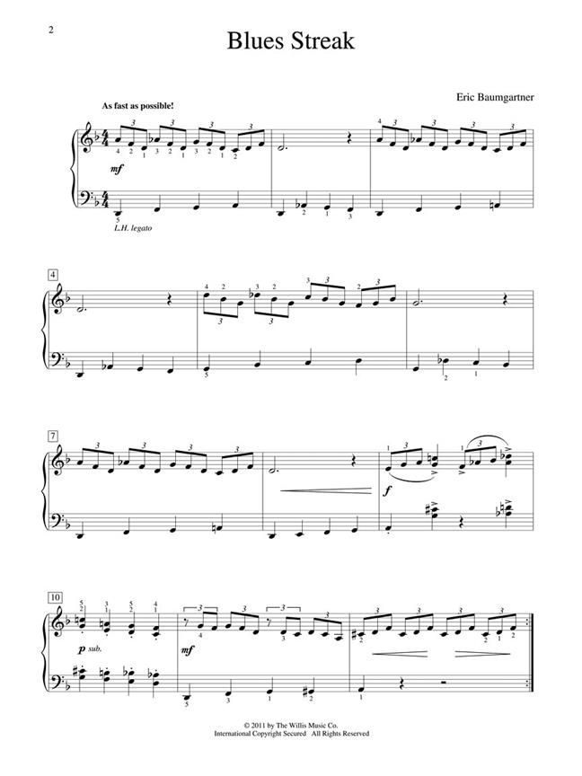 Marked as fast as possible, Blues Streak will appeal to the high-energy, can't-sit-still player that longs to impress. Fun rhythms and contrasting dynamics make this an excellent show-off piece! Key: D Minor.