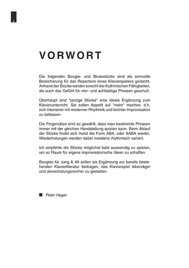 Boogies für 'Jung & Alt' bieten die Möglichkeit, ergänzend zur bestehenden Klavierliteratur, das Musizieren am Klavier noch lebendiger und abwechslungsreicher zu gestalten. Geeignet für Unterricht, Freizeit und Spaß am Klavier.