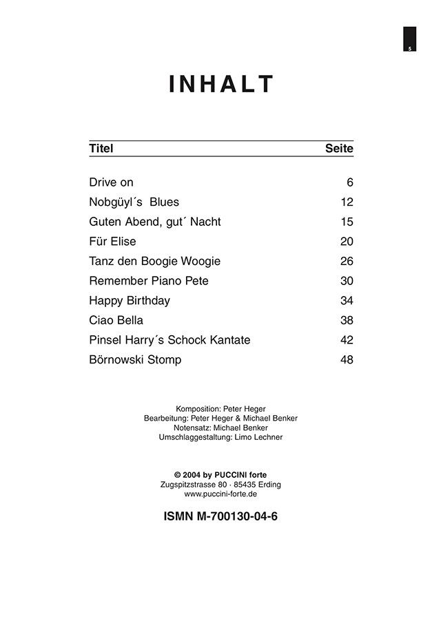 BAND 5 umfasst 10 anspruchsvolle Boogie-, Swing- und Bluesstücke für technisch und musikalisch hohe Ansprüche. Beliebt ist die Verknüpfung von Boogie und Klassik bei einigen Stücken. Zum leichteren Erlernen ist dem Heft eine CD beigelegt.