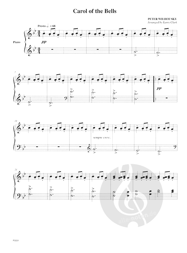 Holiday favorite Carol of the Bells has been arranged for intermediate piano to facilitate performance by any level of age of player. This new solo arrangement is perfect for recital or your next holiday gathering.