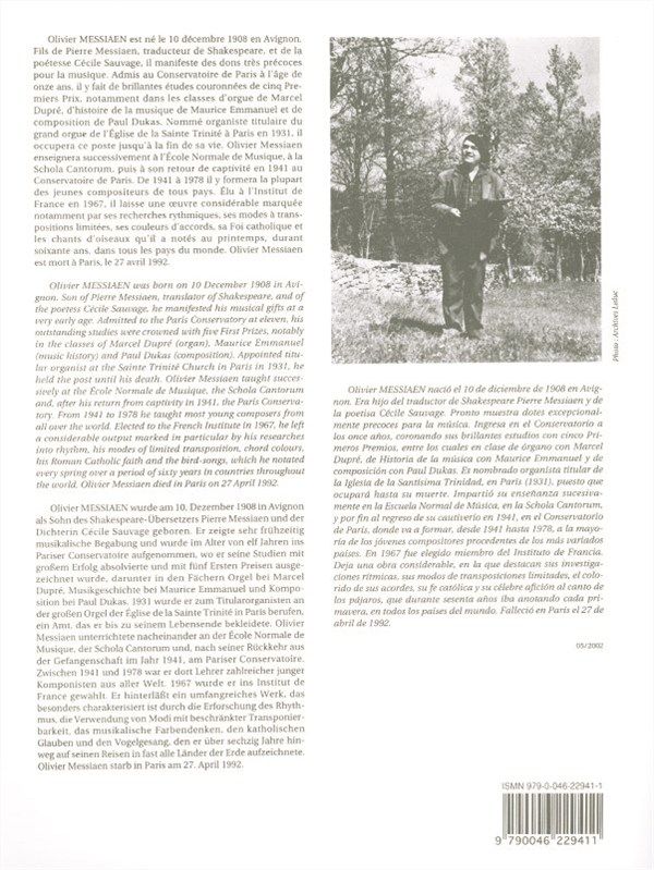 Olivier Messiaen (1908-1992) is known for his unique composition style. Incorporating complex rhythms, harmony, melodies and his passion for ornithology, his Catalogue of Birds for Piano is no exception to the composer's popular, distinctive style. Messiaen became fascinated by birdsong from an early age, however, it wasn't until the 1950s that he took his passion to a new level, incorporating birdsong into all of his compositions. Catalogue of Birds, composed in 1958, comprises thirteen movements, each depicting a specific bird. The third volume contains movements five and six - Tawny Owl and Woodlark. Catalogue of Birds is essential to all advanced pianists seeking to expandand vary their repertoire.