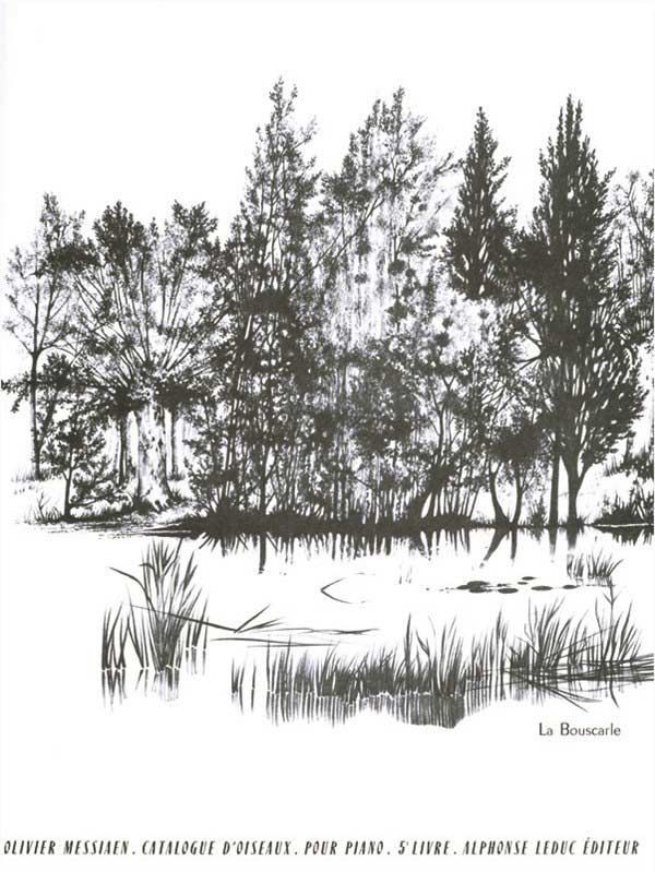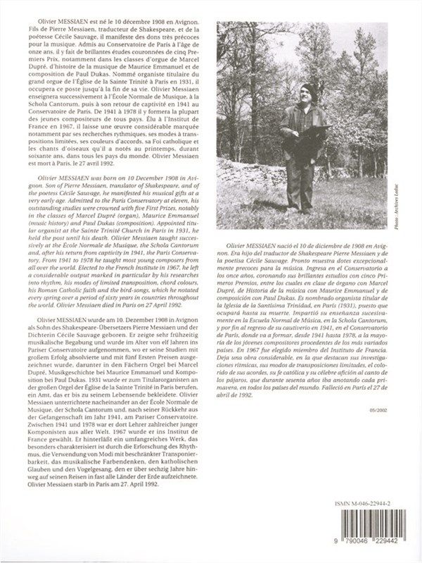 The Bird Catalogue by Olivier Messiaenis a set of 7 books with 13 pieces for Piano composed between 1956 and 1958. Each volume refers to a special bird and to the region where the bird is typically from in France. The piece notonly describes the bird, it also depicts its surroundings, such as other birds, the landscape of its area, the colours and the temperature. Book 1 - Le Chocard des Alpes (Alpine Chough) - Le Loriot (Golden Oriole) IH Le MerleBleu (Blue Rock Thrush) Book 2 - Le Traquet Stapazin (Black-Eared Wheatear) Book 3 - La Chouette Hulotte (Tawny Owl) - L'Alouette Lulu (Wood Lark) Book 4 - La Rousserolle Effarvatte (Reed Warbler) Book 5 - L'AlouetteCalandrelle (Short-Toed Lark) - La Bouscarle (Cetti's Warbler) Book 6 - Le Merle de Roche (Rock Thrush) Book 7 - La Buse Variable (Buzzard) - Le Traquet Rieur (Black Wheatear) - Le Courlis Cendré (Curlew) As mentionedabove, this 5th volume focuses on the Short-toed Lark and the Cetti's Warbler. The first one, the Short-toed Lark represents the wilderness of Provence and the Cetti's Warbler, the Charente area. The interpretation of thesepieces requires a strong level in Piano (upper advanced), due to some complex technique requirement. Olivier Messiaen (1908-1992) was a French organist and composer who was passionate about Ornithology and one of the mostimportant composers of his century. Inspired by Japanese music, he had a very special way of composing and his work can be identified by its complexity, its diatonic aspect, its harmony with limited transposition, its colour andits additive rhythms. He composed many works related to ornithology and birdsong, including the 'Treatise on rhythm, colour and ornithology' in 7 volumes.