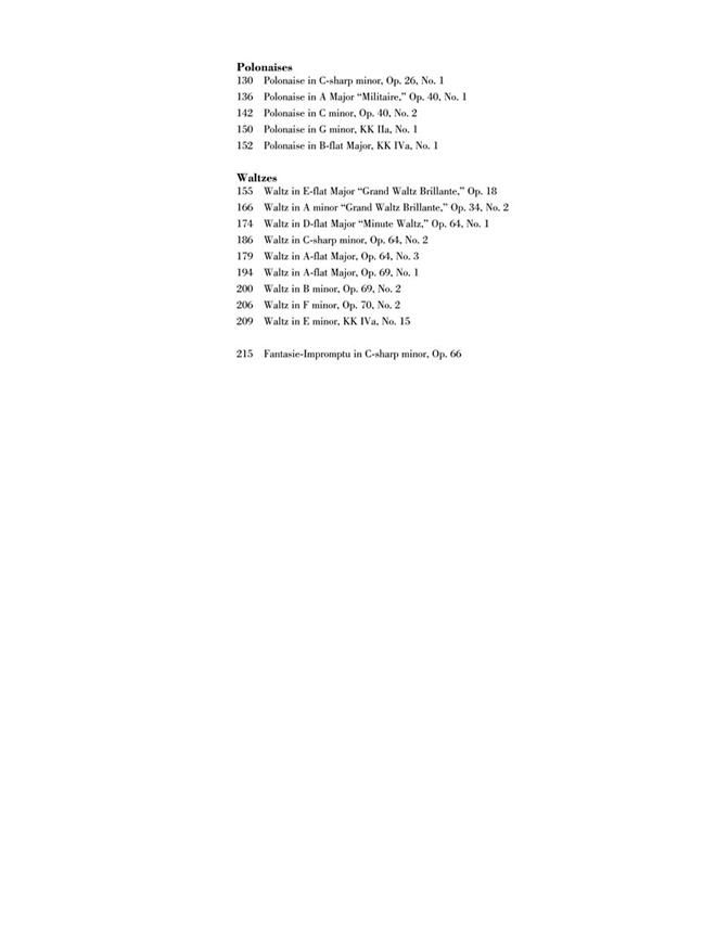 52 newly-engraved intermediate to advanced piano pieces by Chopin printed on eye-pleasing cream-colored paper. Includes: 12 Preludes, 16 Mazurkas, 9 Nocturnes, 5 Polonaises, 9 Waltzes, and the Fantaisie-Impromptu. 228 pages.
