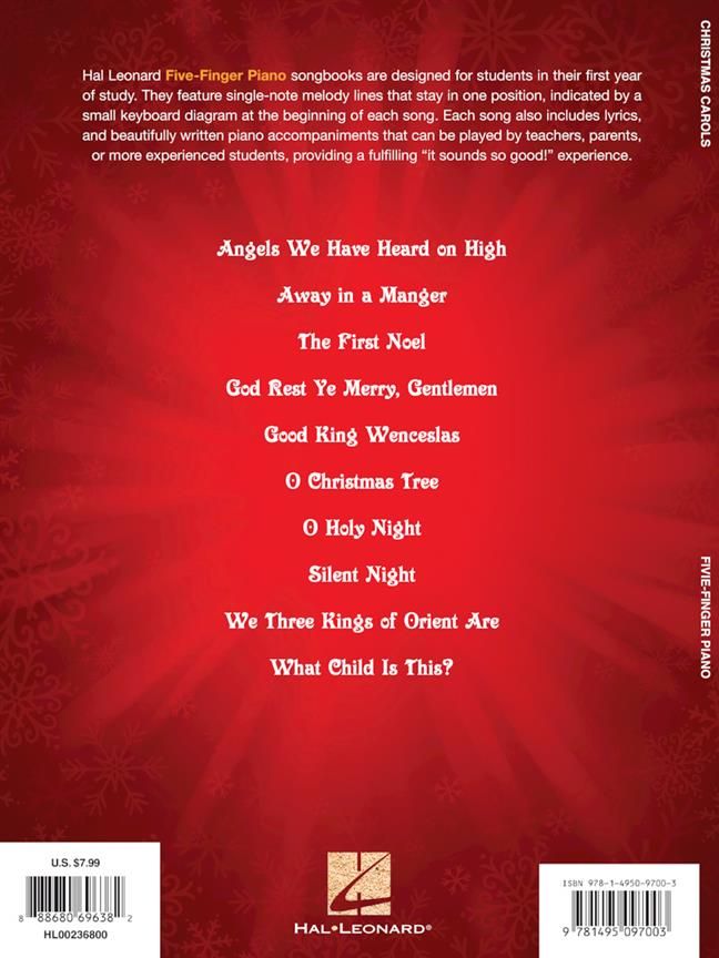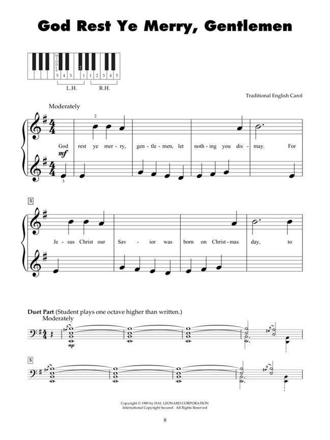 Ten traditional carols arranged for beginning pianists: Angels We Have Heard on High - Away in a Manger - The First Noel - God Rest Ye Merry, Gentlemen - Good King Wenceslas - O Christmas Tree - O Holy Night - Silent Night - We Three Kings of Orient Are - What Child Is This?
