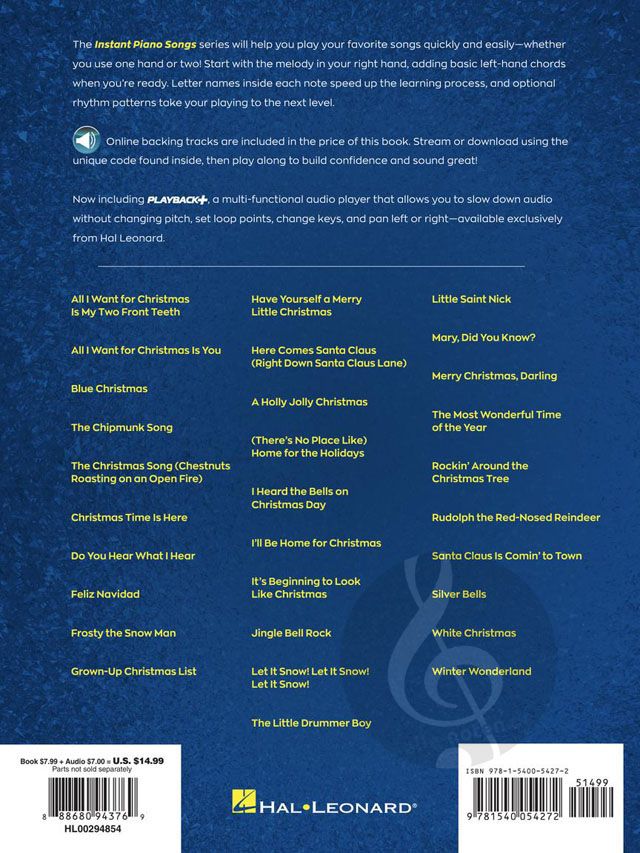 The Instant Piano Songs series will help you play you favorite songs quickly and easily - whether you use one hand or two! Start with the melody in your right hand, then add basic left-hand chords when you're ready. Letter names inside each note speed up the learning process, and optional rhythm patterns take your playing to the next level. Online backing tracks are also included. Stream or download the tracks using the unique codes inside each book, then play along to build confidence and sound great! This edition includes 30 Christmas songs: Blue Christmas - The Chipmunk Song - Frosty the Snow Man - A Holly Jolly Christmas - I'll Be Home for Christmas - Jingle Bell Rock - Little Saint Nick - Mary, Did You Know? - Rudolph the Red-Nosed Reindeer - Silver Bells - Winter Wonderland - and more. Audio is accessed online using the unique code inside the book and can be streamed or downloaded. The audio files include PLAYBACK+, a multi-functional audio player that allows you to slow down audio without changing pitch, set loop points, change keys, and pan left or right.