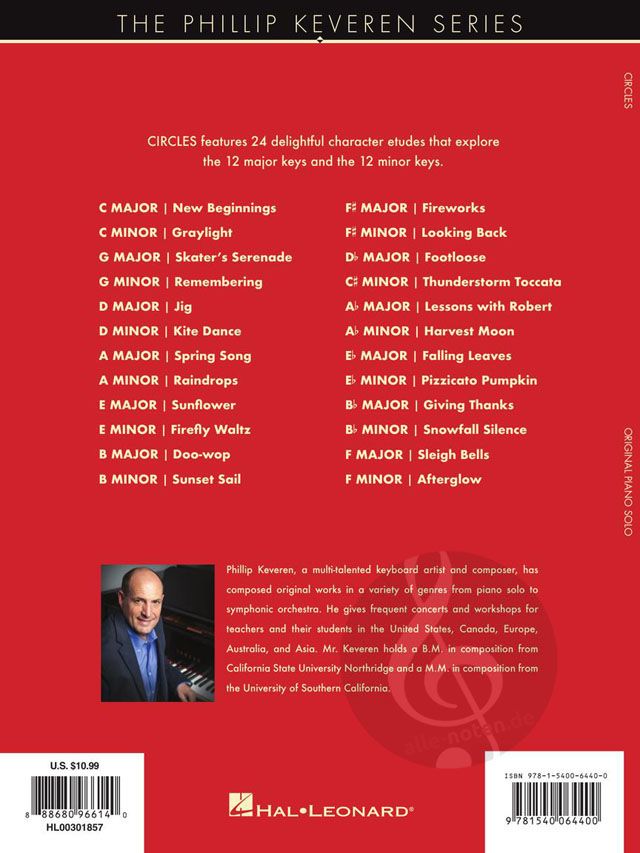 Circles features 24 original character etudes by Phillip Keveren, representing all of the 12 major and minor keys. These brief solos range widely in emotion and each is absolutely delightful to play. The set was inspired by the calender months from the viewpoint of someone living in the northern hemisphere (where Keveren grew up), therefore the C Major etude is also titled New Beginnings while F Major, the penultimate etude, is called Sleigh Bells. May be performed as a set, in selected keys, or individually.
