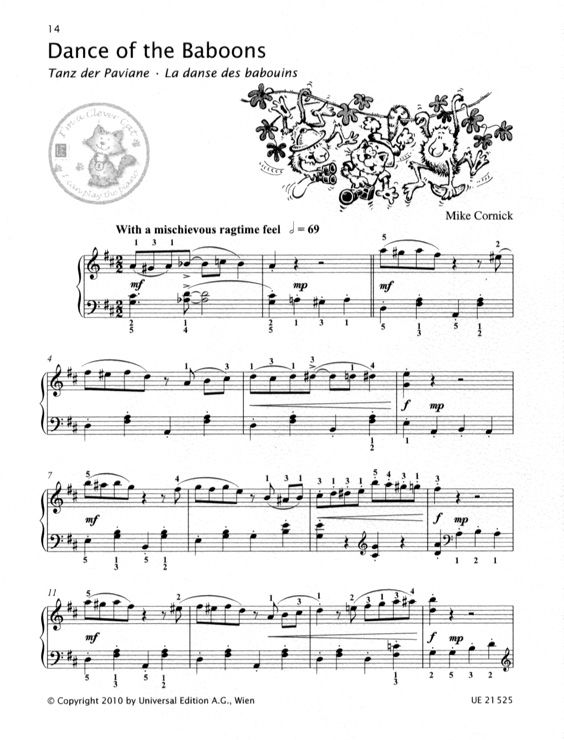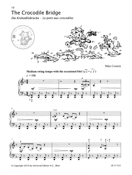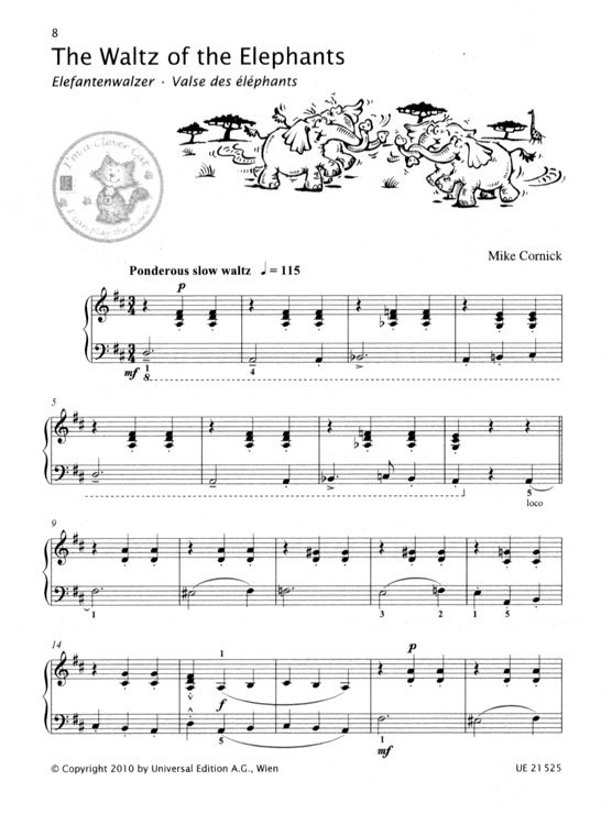 Wieder einmal geht Clever Cat mit seinem Klavier auf Reisen. Nachdem er sich in den ersten drei Bänden vom Klavierhocker über die Meeresküste bis hinauf in die Lüfte gespielt hat, wagt er im neuesten Band eine besonders exotische musikalische Reise. Ganz nach dem bekannten Vorbild macht er sich in den 9 kurzen Stücken an die Erkundung der verschiedensten Musikstile. Seine Safari führt ihn in die afrikanische Wildnis, wo er unter anderem lebhafte Bekanntschaft mit Walzer-Elefanten, Ragtime-Pavianen, Tango-Straussen und Swing-Krokodilen macht. Und die Giraffe lädt in einer Liedversion sogar zum Singen ein. Wie immer bewegt sich Mike Cornick effektvoll im einfach zu spielenden Level und verbindet auf wunderbare Weise das Kreative im Jazz mit solider klassischer Ausbildung. Wurde ein Stück erfolgreich gespielt, darf dies der Schüler mit einen 'Clever Cat Sticker' im Heft kennzeichnen.