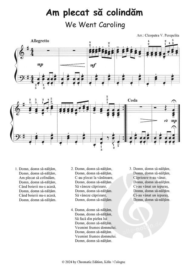 Colinde (Weihnachtslieder) sind traditionelle rumänische Lieder, die von der rumänischen Folklore und den Traditionen des rumänischen Volkes inspiriert sind. Sie sind vorchristlichen Ursprungs, gehören einem episch-lyrischen Genre an und umfassen im Allgemeinen zwischen 20 und 60 Verse. Colinde werden zu Weihnachten und zum Neujahr gesungen. Diese Lieder enthalten gute Wünsche, Worte mit positiver Ladung, die die Geburt des Sohnes Gottes auf Erden verherrlichen und den Übergang in ein neues Jahr vorbereiten, von dem Besseres erwartet wird: bessere und mehr Früchte, Wohlstand in der Gemeinschaft, Gesundheit, Harmonie in der Familie, Liebe und Fülle im Haus.