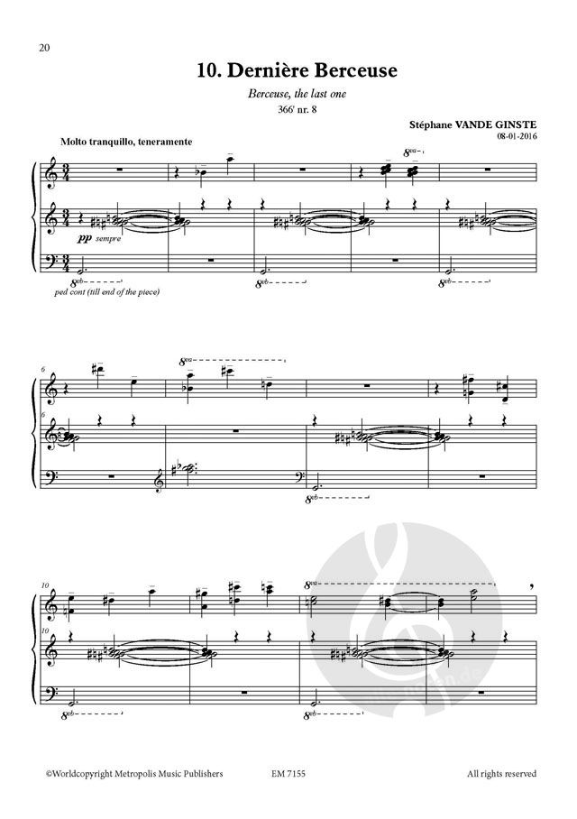 On January 1st, 2016, Stephane Vande Ginste had an extraordinary intention: he planned to compose a 1-minute piece for piano every single day for the whole year. The result is an impressive collection of piano miniatures which - although contemporary - result in a variety of musical styles: apart from some experimental pieces, there are jazzy- and poppy pieces, more traditional 'etudes', polyphonic compositions and so on... The 366 pieces also tell various stories: from very emotional events like the terrorist attacks in Brussels over homages in honor of deceased artists (David Bowie,...) to birthdays and festive occasions,... . More than once, even poetry (Heinrich Heine, Anna Enquist, ..) or other pieces of art inspired Stephane to compose his daily one-minute piece. Every single composition originated from the 'here and now', and therefore capture the unfiltered feelings and emotions of that very unique moment in time: joy, enthusiasm, but also melancholy and sadness.