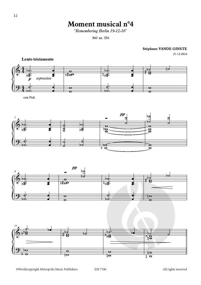 On January 1st, 2016, Stephane Vande Ginste had an extraordinary intention: he planned to compose a 1-minute piece for piano every single day for the whole year. The result is an impressive collection of piano miniatures which - although contemporary - result in a variety of musical styles: apart from some experimental pieces, there are jazzy- and poppy pieces, more traditional 'etudes', polyphonic compositions and so on... The 366 pieces also tell various stories: from very emotional events like the terrorist attacks in Brussels over homages in honor of deceased artists (David Bowie,...) to birthdays and festive occasions,... . More than once, even poetry (Heinrich Heine, Anna Enquist, ..) or other pieces of art inspired Stephane to compose his daily one-minute piece. Every single composition originated from the 'here and now', and therefore capture the unfiltered feelings and emotions of that very unique moment in time: joy, enthusiasm, but also melancholy and sadness.