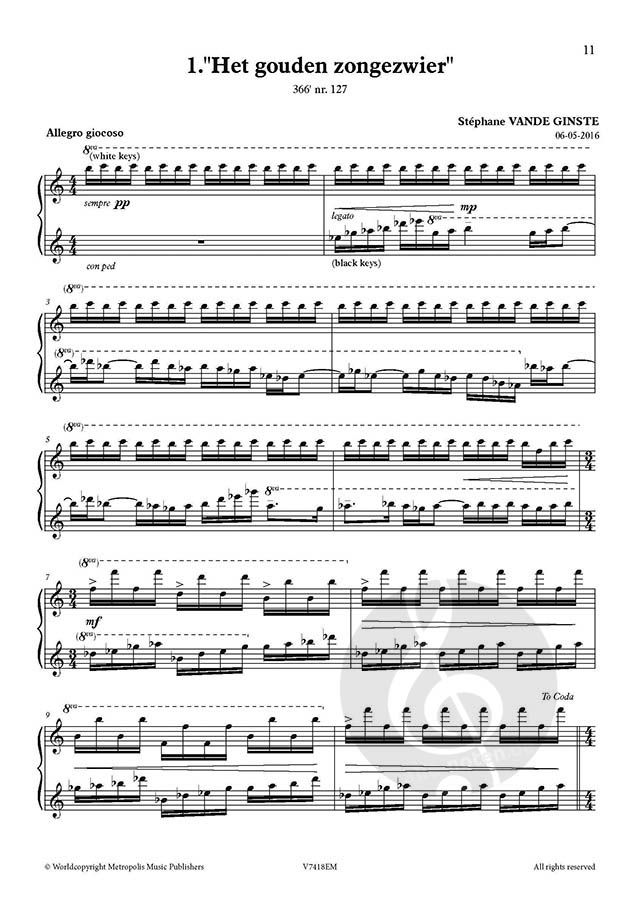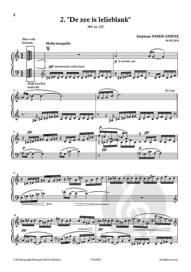 On January 1st, 2016, Stephane Vande Ginste had an extraordinary intention: he planned to compose a 1-minute piece for piano every single day for the whole year. The result is an impressive collection of piano miniatures which - although contemporary - result in a variety of musical styles: apart from some experimental pieces, there are jazzy- and poppy pieces, more traditional 'etudes', polyphonic compositions and so on... The 366 pieces also tell various stories: from very emotional events like the terrorist attacks in Brussels over homages in honor of deceased artists (David Bowie,...) to birthdays and festive occasions,... . More than once, even poetry (Heinrich Heine, Anna Enquist, ..) or other pieces of art inspired Stephane to compose his daily one-minute piece. Every single composition originated from the 'here and now', and therefore capture the unfiltered feelings and emotions of that very unique moment in time: joy, enthusiasm, but also melancholy and sadness.