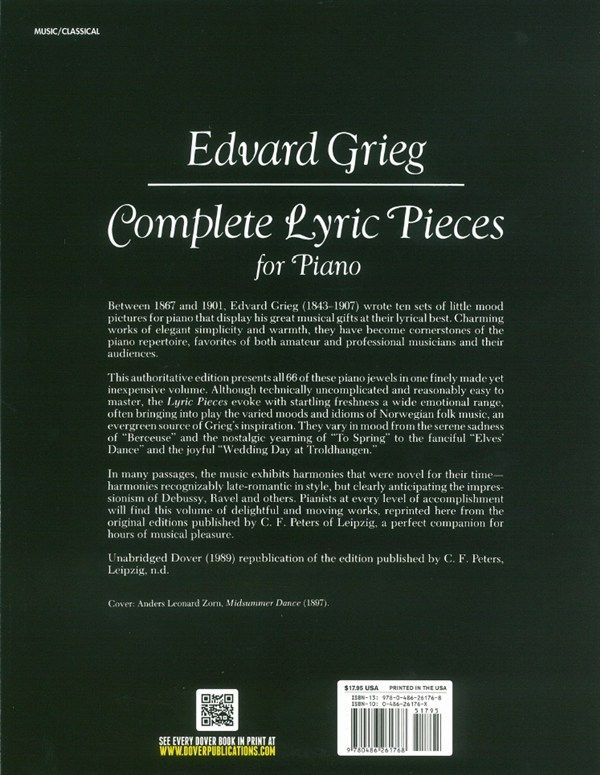 All 66 works from the 10 sets of little mood pictures created for piano by the Norwegian composer from 1867 to 1901, reprinted from the authoritative C. F. Peters edition. Technically uncomplicated and reasonably easy to master, these popular works have been favorites of generations of pianists, both amateur and professional.