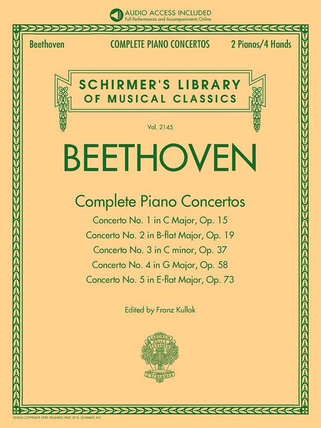 Beethoven's five piano concertos remain staples of the repertoire. This collection gives pianists the opportunity to play along with professionally recorded orchestral accompaniments, making it a valuable resource for concerto performance preparation. CONTENTS: Concerto No. 1 in C Major, Op. 15 Concerto No. 2 in B-flat Major, Op. 19 Concerto No. 3 in C minor, Op. 37 Concerto No. 4 in G Major, Op. 58 Concerto No. 5 in E-flat Major, Op. 73 Emperor