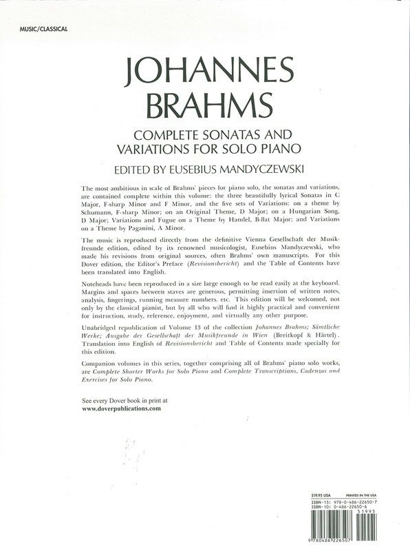The most ambitious in scale of Brahms' pieces for piano solo, the sonatas and variations are contained complete within this volume. The music is reproduced directly from the definitive Vienna Gesellschaft der Musikfreunde edition.