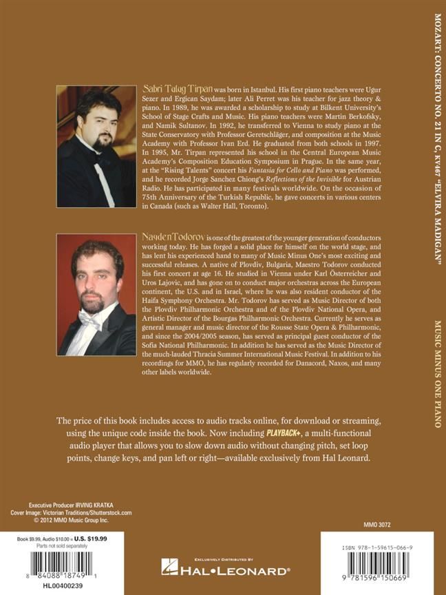Accompaniment: Vidin Philharmonic Orchestra - This justifiably famous piano concerto, with its gorgeous Andante theme, became a popular hit when it was used in the film Elvira Madigan. Lush melodies orchestrated in Mozart's inimitable style-graceful and elegant pianism throughout. The Classical piano concerto at its height! This deluxe Audio Access set includes a slow-tempo practice version to help you get up to speed.