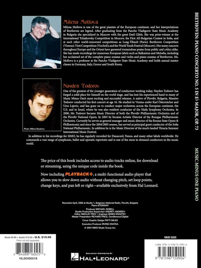 The immortal 'Emperor' of Beethoven is given the ceremonial treatment in this stunning digital recording of this, one of history's greatest piano concerti. World-renowned virtuoso and Beethoven specialist Milena Mollova repeats her famed rendition of this masterpiece for your enjoyment and reference, then you take center stage with this champion for all champions! Soaring themes, luscious orchestrations and Beethoven's stamp of genius make this the concerto above all others for classical pianists. You will love it! Includes a high-quality printed music score with informative liner notes and online audio containing a complete version with soloist, then a second performance of the orchestral accompaniment, minus you, the soloist. The audio is accessed online using the unique code inside each book and can be streamed or downloaded. The audio files include PLAYBACK+, a multi-functional audio player that allows you to slow down audio without changing pitch, set loop points, change keys, and pan left or right.