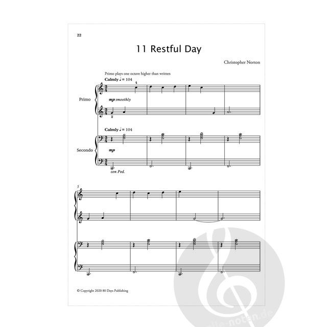 Christopher Nortons unverwechselbare Beiträge zur Klavierliteratur schlagen erfolgreich die Brücke zwischen traditioneller Klavierliteratur und Musik in zeitgenössischen populären Stilen. Christopher Norton ConnectionsTM for Piano enthält über 200 neu komponierte Stücke, die sorgfältig ausgewählt, bearbeitet und in eine Reihenfolge gebracht wurden, die zehn Schwierigkeitsstufen von der Grundstufe bis zu den Fortgeschrittenen abdeckt.Connections Duets eignen sich besonders für Anfänger (jeden Alters). Die attraktiven Begleitungen, die nicht allzu schwer zu spielen sind, sorgen für harmonischen und rhythmischen Reichtum. Ein Lehrer kann den Secondo-Teil spielen, oder ein Schüler. Diese Stücke bieten eine großartige Gelegenheit, Ensembles in zeitgenössischen Stilen auf einer sehr jährlichen Stufe zu spielen, und werden sich als unterhaltsame Ergänzungen des Aufführungsrepertoires junger Spieler als beliebte Auswahl für Liederabende, Festivals, informelle Aufführungen und sogar Prüfungen erweisen. Auch Eltern und Freunde werden sich an ihnen erfreuen, was zu einer positiven Erfahrung für den Interpreten führt.