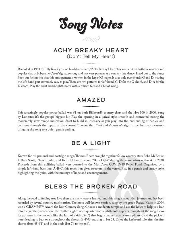 Now kids can confidently play 25 favorite country songs right away! This collection of easy piano arrangements feature simple melody lines and accompaniment patterns that are easy to read, as well as song notes and practice tipsfor each songs. Includes: Bless the Broken Road (Rascal Flatts) - Crazy (Patsy Cline) - The Devil Went Down to Georgia (Charlie Daniels Band) - The Gambler (Kenny Rogers) - God Bless the U.S.A. (Lee Greenwood) - I Hope You Dance(Lee Ann Womack) - Love Me Tender (Elvis Presley) - Ring of Fire (Johnny Cash) - Sixteen Tons (Tennessee Ernie Ford) - and more.