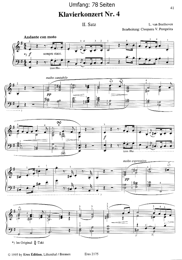 Einfache Bearbeitungen einzelner Sätze und Teile von beliebten Klavierkonzerten für Klavier solo mit Einführung in die Werke und mit Kurzbiographien der Meister.Ludwig van BeethovenKonzert für Klavier und Orchester Nr. 1 C-Dur Op.15, 3.SatzKonzert für Klavier und Orchester Nr. 2 B-Dur Op.19, 3.SatzKonzert für Klavier und Orchester Nr. 3 c-moll Op.37 1.u.3.SatzKonzert für Klavier und Orchester Nr.4 G-Dur Op.58 2.SatzKonzert für Klavier und Orchester Nr.5 Es-Dur Op.73 1.-3.SatzFelix Mendelssohn BartholdyKonzert für Klavier und OrchesterNr.1 g-moll Op.25 1.SatzRobert SchumannKonzert für Klavier und Orchester a-moll Op.54 2.SatzSchon in meiner Kindheit, als ich Klavier studierte und in Konzerte ging, träumte ich immer davon, die schwer zu spielenden großen Konzerte für Klavier und Orchester allein am Klavier zu spielen. Später stellte ich fest, dass viele Musikliebhaber denselben Wunsch haben, und so begann ich die Klavierkonzerte zu bearbeiten. Ich habe deshalb beliebte Sätze und Teile aus Klavierkonzerten ausgewählt und für Klavier zweihändig bearbeitet, um vielen die Möglichkeit zu geben, die Konzerte allein am Klavier spielen zu können. Um der Musik näher zu kommen und den Inhalt der jeweiligen Konzerte besser kennen zu lernen, habe ich in kurzer Fassung eine Erklärung über die Instrumentalkonzerte, über Leben und Werk der Komponisten und seinen Einfluss zur Entwicklung der Klavierkonzerte gegeben. Damit hoffe ich, den Musikliebhabern zu helfen, in der Musik ein Stück weiter zu kommen. (C.V.P.)