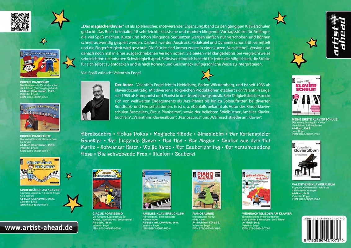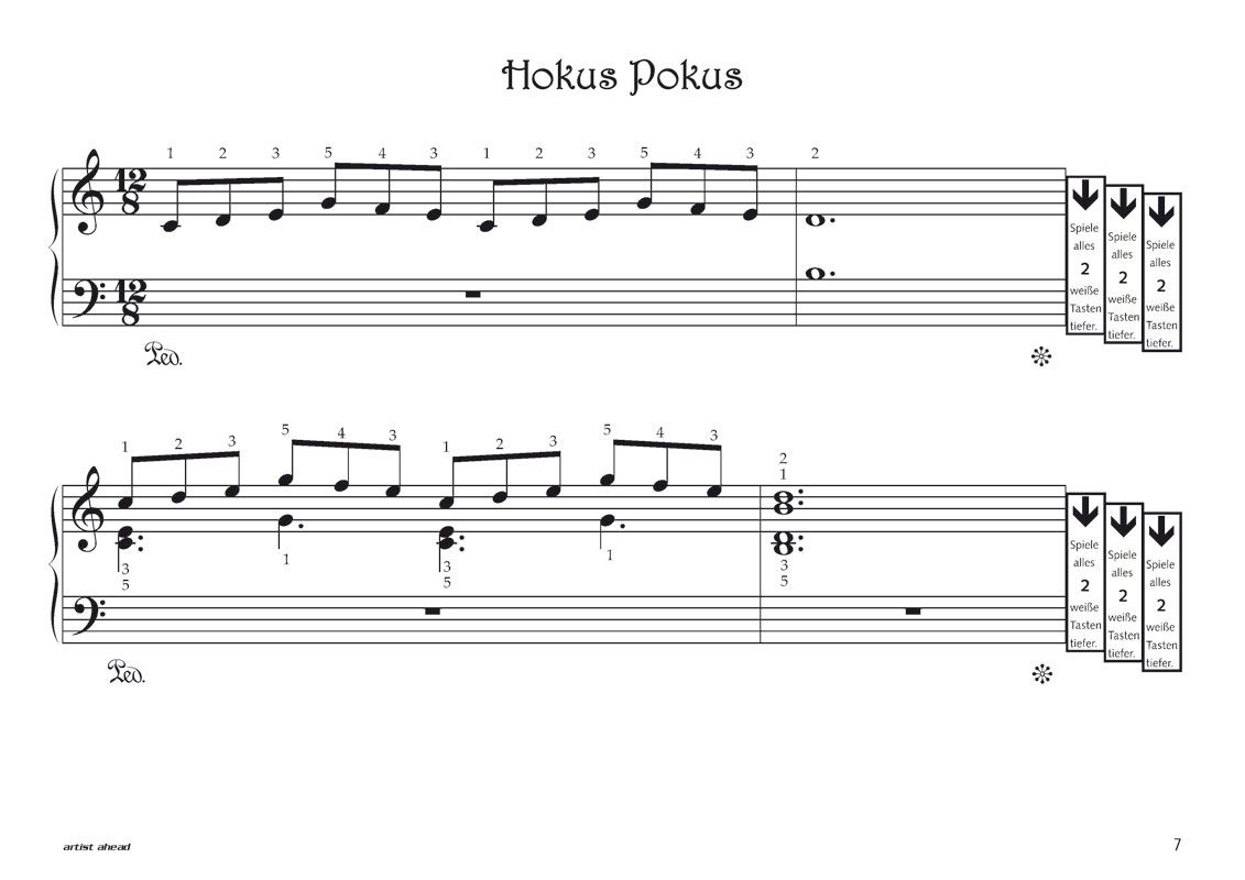 Das magische Klavier' ist als spielerischer, motivierender Ergänzungsband zu den gängigen Klavierschulen gedacht. Das Buch beinhaltet 18 sehr leichte klassische und modern klingende Vortragsstücke für Anfänger, die viel Spaß machen. Kurze und schön klingende Sequenzen werden einfach nur verschoben und können schnell auswendig gespielt werden. Dadurch werden Ausdruck, Pedalspiel und Dynamik schon früh vermittelt und die Fingerfertigkeit wird geschult. Die Stücke sind immer zuerst in einer kurzen 'Verschiebe'-Version und danach noch mal in einer ausgeschriebenen Version notiert. Sie bieten viel Klangerlebnis bei vergleichsweise sehr leichtem technischen Schwierigkeitsgrad. Selbstverständlich besteht für jeden die Möglichkeit, die Stücke für sich selbst zu entdecken und je nach Können und Geschmack auf persönliche Weise zu interpretieren.